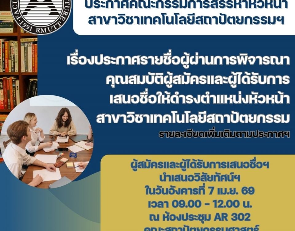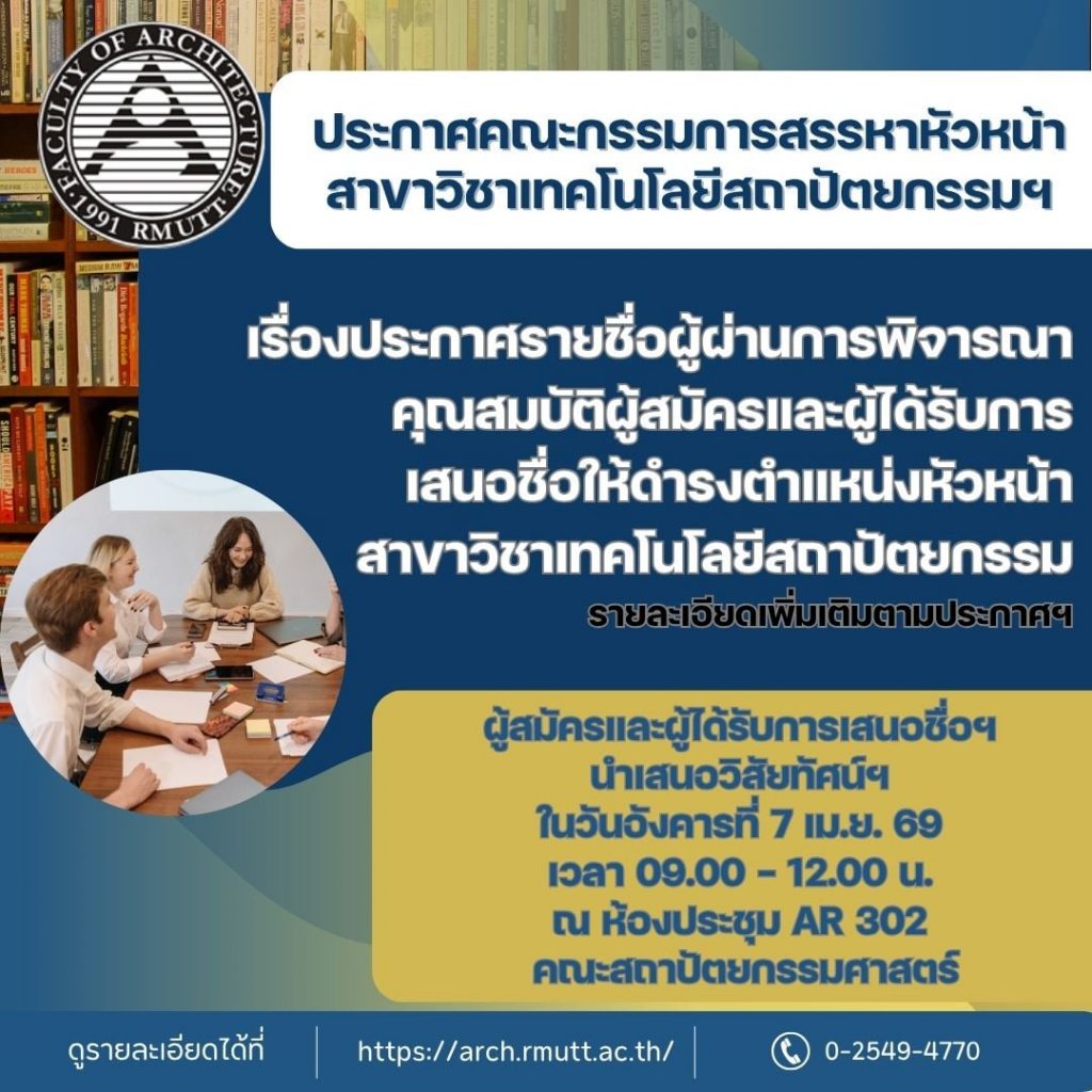 ศิษย์เก่าสถาปัตยกรรมฯ ราชมงคลธัญบุรีคว้ารางวัล “ศิษย์เก่าดีเด่น”November 19, 2024แลกเปลี่ยนองค์ความรู้ สร้างเครือข่าย พัฒนาเจริญกรุง IWAH ConsoritiumNovember 29, 2024 สุดยอดแห่งความภาคภูมิใจ! ส่องบรรยากาศซ้อมใหญ่ก่อนรับปริญญา มทร.ธัญบุรี November 21, 2024 Categories กิจกรรม ข่าวประชาสัมพันธ์ Tags คณะสถาปัตยกรรมศาสตร์รับปริญญางานรับปริญญาบัณฑิตใหม่มทรธัญบุรีรับปริญญา ราชมงคลธัญบุรีสถาปัตยกรรมเกียรตินิยม ข่าวประชาสัมพันธ์ คณะสถาปัตยกรรมศาสตร์ มทร.ธัญบุรี ขอแสดงความยินดีกับบัณฑิต รุ่นที่ 29 (UNIT) ทุกท่าน วันซ่อมใหญ่พิธีพระราชทานปริญญาบัตร คณะสถาปัตยกรรมศาสตร์ มหาวิทยาลัยเทคโนโลยีราชมงคลธัญบุรี เมื่อวันพุธที่ 20 พฤศจิกายน 2567 คณะสถาปัตยกรรมศาสตร์ มหาวิทยาลัยเทคโนโลยีราชมงคลธัญบุรี ได้จัดงานฝึกซ้อมใหญ่สำหรับพิธีพระราชทานปริญญาบัตร ครั้งที่ 38 ประจำปีการศึกษา 2566 โดยมีบัณฑิตรุ่นที่ 29 (UNIT) เข้าร่วมอย่างคับคั่ง บรรยากาศเต็มไปด้วยความยินดีและความภาคภูมิใจของบัณฑิตและครอบครัว คณะสถาปัตยกรรมศาสตร์ มหาวิทยาลัยเทคโนโลยีราชมงคลธัญบุรี ขอแสดงความยินดีกับบัณฑิตทุกท่าน ที่จะเข้าร่วมพิธีพระราชทานปริญญาบัตรครั้งที่ 38 ประจำปีการศึกษา 2566 บรรยากาศการซ้อมใหญ่เมื่อวันที่ 20 พฤศจิกายน 2567 เต็มไปด้วยความตื่นเต้นและความภาคภูมิใจของบัณฑิตและคณาจารย์ทุกท่าน และขอแสดงความยินดีกับบัณฑิตที่ได้รับรางวัลพิเศษ ได้แก่ นางสาวชฏาวัลย์ ธนกุลจงสวัสดิ์ ที่ได้รับรางวัลเกียรตินิยมอันดับ 1 เหรียญทอง นางสาวแสงจันทร์ กลัญชัย ที่ได้รับรางวัลเกียรตินิยมอันดับ 1 เหรียญเงิน ผู้บริหาร คณาจารย์ และบุคคลากร คณะสถาปัตยฯ ขอให้บัณฑิตทุกท่านประสบความสำเร็จในเส้นทางอาชีพและชีวิตส่วนตัวต่อไป และขอให้ความรู้และประสบการณ์ที่ได้รับจากการศึกษาในครั้งนี้เป็นพื้นฐานที่มั่นคงสำหรับการเติบโตในอนาคต Share0 Related postsApril 5, 2026ประกาศสรรหาหัวหน้าสาขาเทคโนโลยีสถาปัตยกรรมRead moreคณะสถาปัตยกรรมศาตร์ประกาศสรรหาหัวหน้าสาขาเทคโนโลยีสถาปัตยกรรมศาสตร์ March 19, 2026ประกาศคณะกรรมการสรรหาหัวหน้าสาขาเทคโนโลยีสถาปัตยกรรมRead moreMarch 19, 2026รางวัลการประกวดเวทีระดับโลก อาญาสถาปัตย์-ธัญบุรี คว้าไปรับรางวัลถึง 3 รางวัลRead more