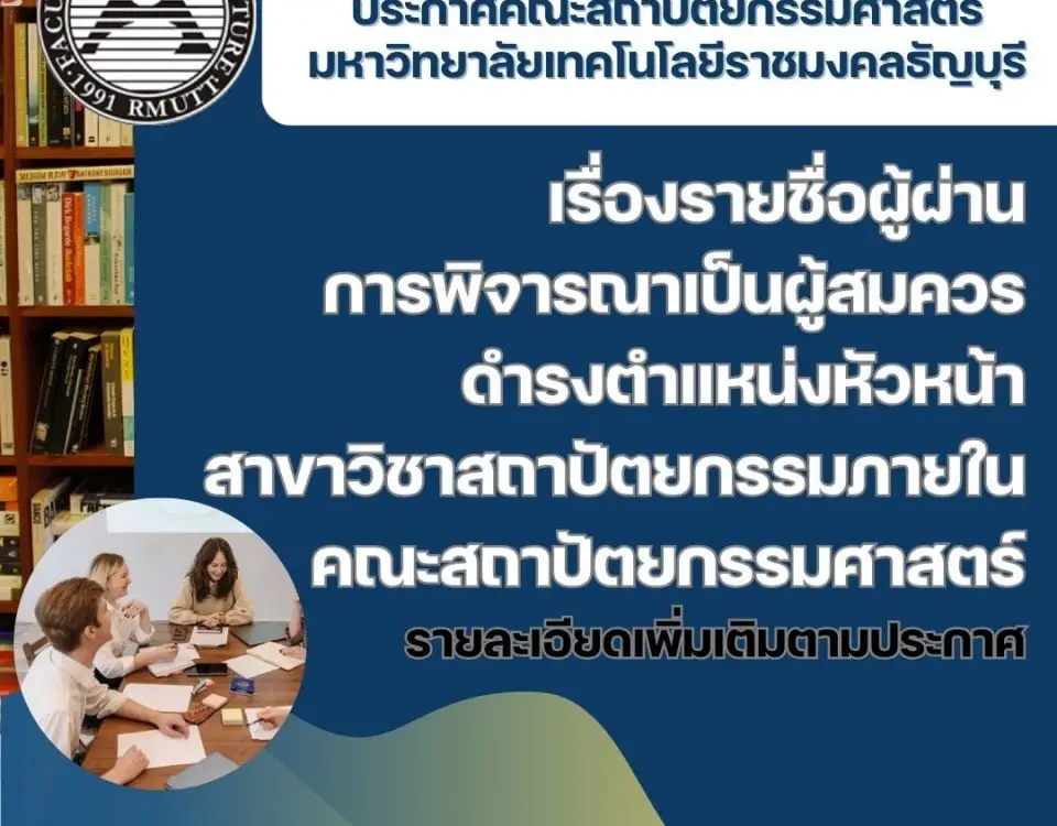 รับสมัครนักศึกษาปริญญาโท (รอบ2)April 25, 2025ประกาศจากสำนักวิทยบริการฯ: ขอความร่วมมือจัดการพื้นที่ Cloud Storage OneDrive และ MS TeamsAugust 4, 2025 ประกาศผู้ชนะการเสนอราคา ประกวดราคาซื้อเพิ่มประสิทธิภาพการศึกษาทางสถาปัตยกรรม ด้วยวิธีประกวดราคาอิเล็กทรอนิกส์ (e-bidding) June 20, 2025 Categories ข่าวประชาสัมพันธ์ Tags ประกาศผู้ชนะการเสนอราคา ประกวดราคาซื้อคอมพิวเตอร์สำหรับพัฒนาศักยภาพงานออกแบบสถาปัตยกรรมในโลกเสมือน จำนวน 25 เครื่อง ด้วยวิธีประกวดราคาอิเล็กทรอนิกส์ (e-bidding) Share0 Related postsSeptember 30, 2025ประกาศ ผู้ดำรงตำแหน่งหัวหน้าสาขาวิชาสถาปัตยกรรมภายในRead moreSeptember 25, 2025ประกาศรายชื่อผู้สมัครและผู้ได้เสนอชื่อให้ดำรงตำแหน่งหัวหน้าสาขาสถาปัตยกรรมภายในRead moreSeptember 2, 2025เปิดรับนักศึกษาใหม่ ระดับปริญญาโท (รอบที่ 3) Read more