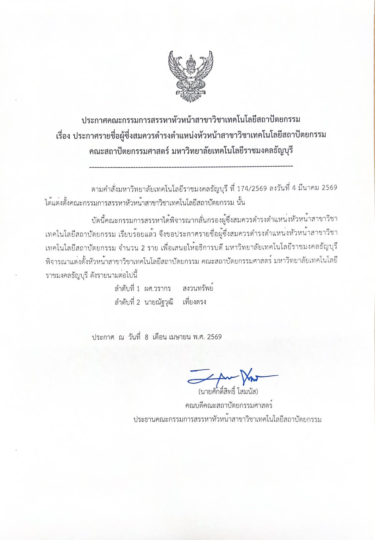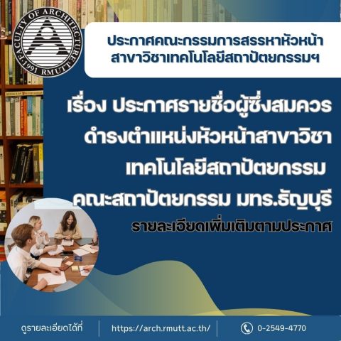 ประกาศสรรหาหัวหน้าสาขาเทคโนโลยีสถาปัตยกรรมApril 5, 2026 ประกาศ ผู้สมควรดำรงตำแหน่งหัวหน้าสาขาวิชาเทคโนโลยีสถาปัตยกรรม April 8, 2026 Categories ข่าวประชาสัมพันธ์ Tags PDF Title Download Share0 Related postsApril 5, 2026ประกาศสรรหาหัวหน้าสาขาเทคโนโลยีสถาปัตยกรรมRead moreคณะสถาปัตยกรรมศาตร์ประกาศสรรหาหัวหน้าสาขาเทคโนโลยีสถาปัตยกรรมศาสตร์ March 19, 2026ประกาศคณะกรรมการสรรหาหัวหน้าสาขาเทคโนโลยีสถาปัตยกรรมRead moreMarch 19, 2026รางวัลการประกวดเวทีระดับโลก อาญาสถาปัตย์-ธัญบุรี คว้าไปรับรางวัลถึง 3 รางวัลRead more